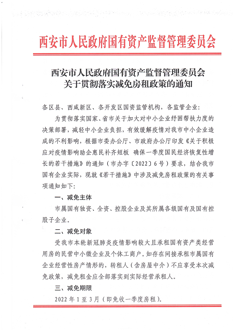 西安市国资委关于做好减免国有企业房屋租金工作有关事项的补充通知